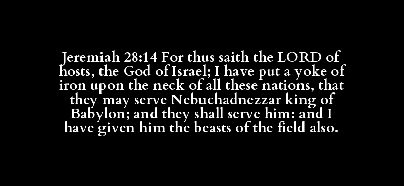 Jeremiah 28:14 For thus saith the LORD of hosts, the God of Israel; I have put a yoke of iron upon the neck of all these nations, that they may serve Nebuchadnezzar king of Babylon; and they shall serve him: and I have given him the beasts of the field also.