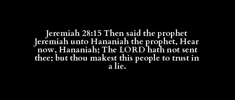 Jeremiah 28:15 Then said the prophet Jeremiah unto Hananiah the prophet, Hear now, Hananiah; The LORD hath not sent thee; but thou makest this people to trust in a lie.