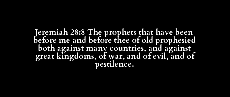 Jeremiah 28:8 The prophets that have been before me and before thee of old prophesied both against many countries, and against great kingdoms, of war, and of evil, and of pestilence.