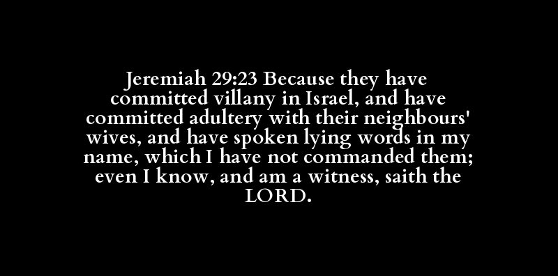 Jeremiah 29:23 Because they have committed villany in Israel, and have committed adultery with their neighbours' wives, and have spoken lying words in my name, which I have not commanded them; even I know, and am a witness, saith the LORD.