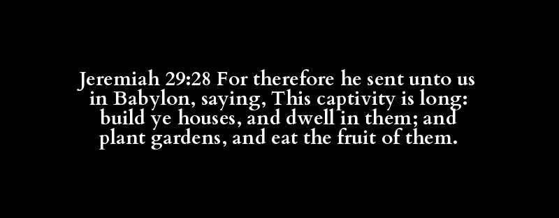 Jeremiah 29:28 For therefore he sent unto us in Babylon, saying, This captivity is long: build ye houses, and dwell in them; and plant gardens, and eat the fruit of them.