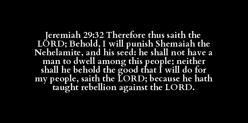 Jeremiah 29:32 Therefore thus saith the LORD; Behold, I will punish Shemaiah the Nehelamite, and his seed: he shall not have a man to dwell among this people; neither shall he behold the good that I will do for my people, saith the LORD; because he hath taught rebellion against the LORD.