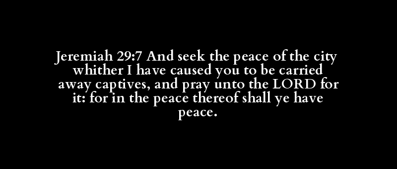 Jeremiah 29:7 And seek the peace of the city whither I have caused you to be carried away captives, and pray unto the LORD for it: for in the peace thereof shall ye have peace.