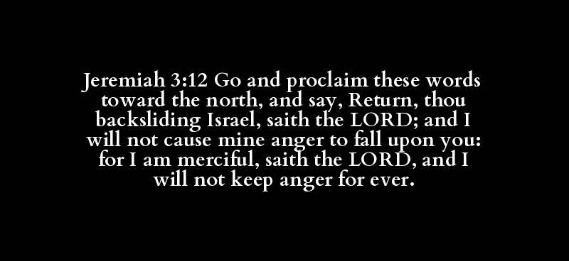 Jeremiah 3:12 Go and proclaim these words toward the north, and say, Return, thou backsliding Israel, saith the LORD; and I will not cause mine anger to fall upon you: for I am merciful, saith the LORD, and I will not keep anger for ever.