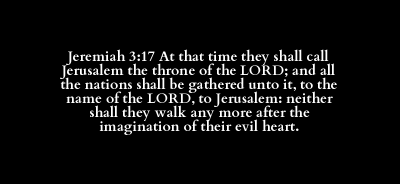 Jeremiah 3:17 At that time they shall call Jerusalem the throne of the LORD; and all the nations shall be gathered unto it, to the name of the LORD, to Jerusalem: neither shall they walk any more after the imagination of their evil heart.
