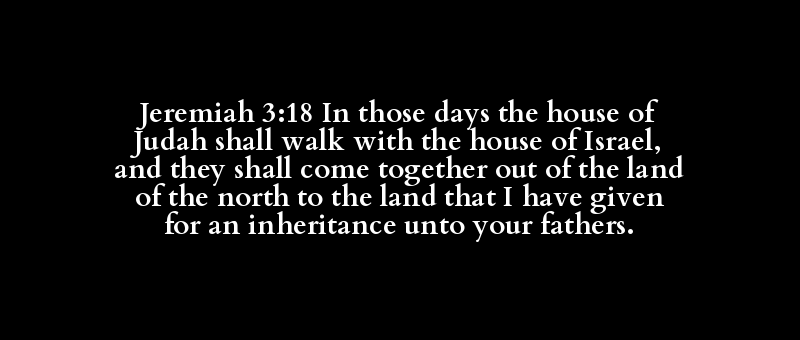 Jeremiah 3:18 In those days the house of Judah shall walk with the house of Israel, and they shall come together out of the land of the north to the land that I have given for an inheritance unto your fathers.