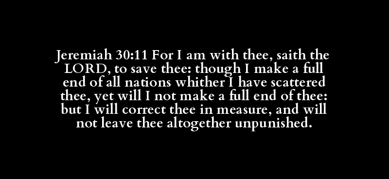 Jeremiah 30:11 For I am with thee, saith the LORD, to save thee: though I make a full end of all nations whither I have scattered thee, yet will I not make a full end of thee: but I will correct thee in measure, and will not leave thee altogether unpunished.