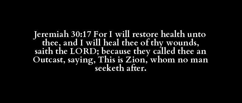 Jeremiah 30:17 For I will restore health unto thee, and I will heal thee of thy wounds, saith the LORD; because they called thee an Outcast, saying, This is Zion, whom no man seeketh after.