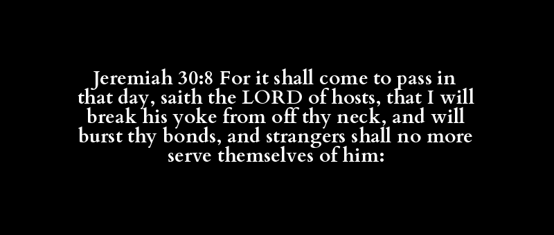 Jeremiah 30:8 For it shall come to pass in that day, saith the LORD of hosts, that I will break his yoke from off thy neck, and will burst thy bonds, and strangers shall no more serve themselves of him: