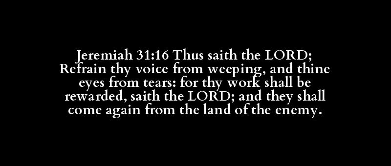 Jeremiah 31:16 Thus saith the LORD; Refrain thy voice from weeping, and thine eyes from tears: for thy work shall be rewarded, saith the LORD; and they shall come again from the land of the enemy.