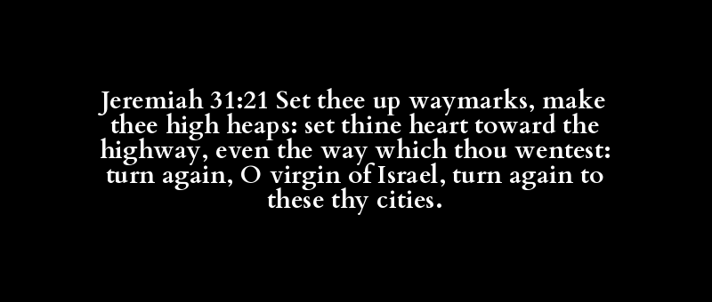 Jeremiah 31:21 Set thee up waymarks, make thee high heaps: set thine heart toward the highway, even the way which thou wentest: turn again, O virgin of Israel, turn again to these thy cities.