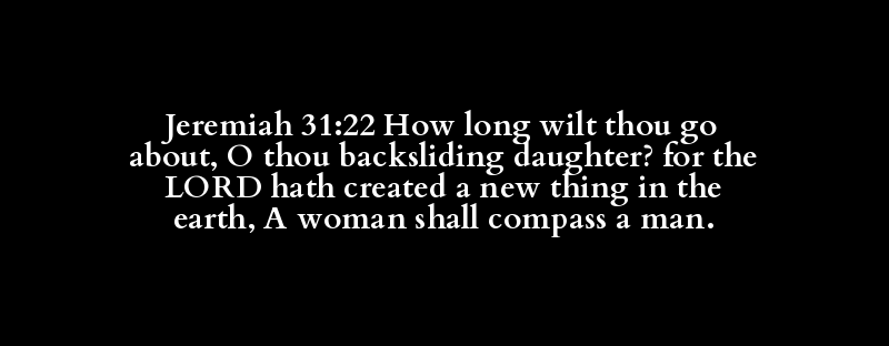 Jeremiah 31:22 How long wilt thou go about, O thou backsliding daughter? for the LORD hath created a new thing in the earth, A woman shall compass a man.