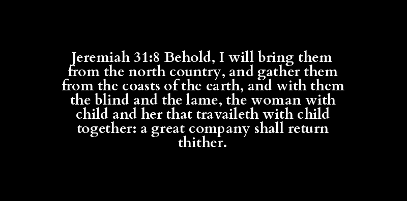 Jeremiah 31:8 Behold, I will bring them from the north country, and gather them from the coasts of the earth, and with them the blind and the lame, the woman with child and her that travaileth with child together: a great company shall return thither.