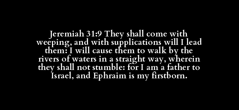 Jeremiah 31:9 They shall come with weeping, and with supplications will I lead them: I will cause them to walk by the rivers of waters in a straight way, wherein they shall not stumble: for I am a father to Israel, and Ephraim is my firstborn.