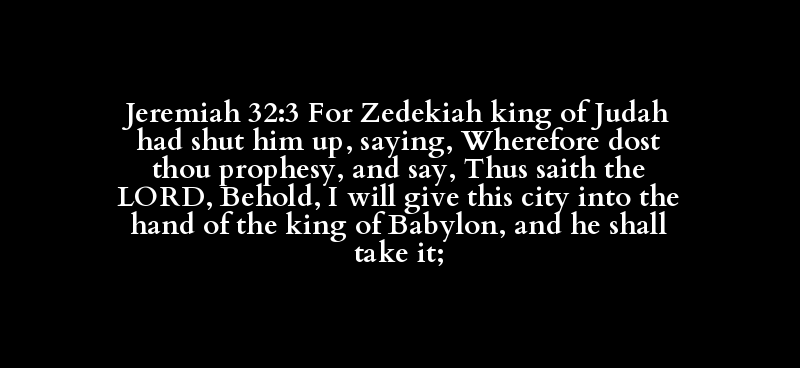 Jeremiah 32:3 For Zedekiah king of Judah had shut him up, saying, Wherefore dost thou prophesy, and say, Thus saith the LORD, Behold, I will give this city into the hand of the king of Babylon, and he shall take it;