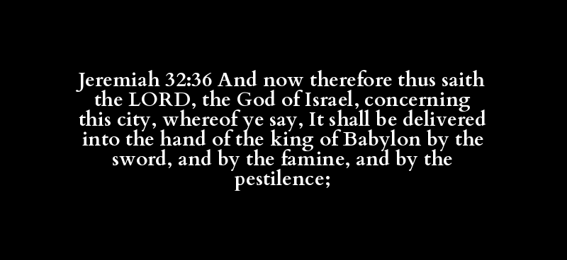 Jeremiah 32:36 And now therefore thus saith the LORD, the God of Israel, concerning this city, whereof ye say, It shall be delivered into the hand of the king of Babylon by the sword, and by the famine, and by the pestilence;