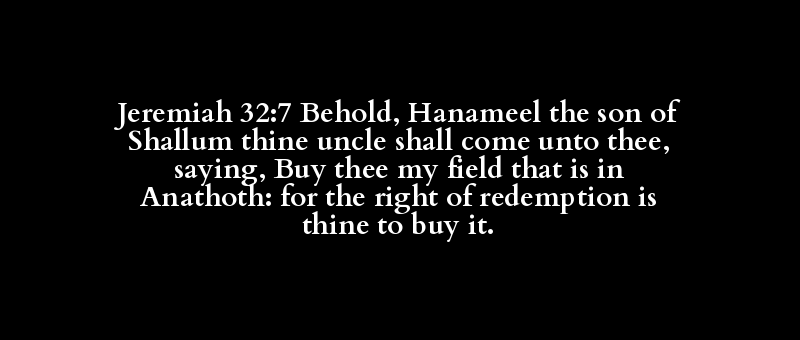 Jeremiah 32:7 Behold, Hanameel the son of Shallum thine uncle shall come unto thee, saying, Buy thee my field that is in Anathoth: for the right of redemption is thine to buy it.
