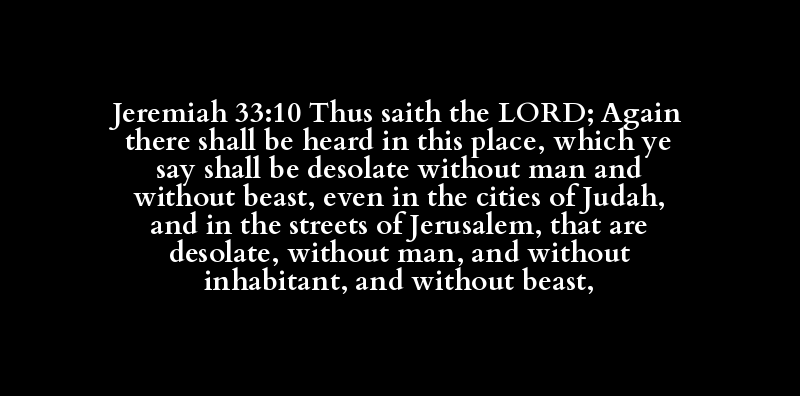 Jeremiah 33:10 Thus saith the LORD; Again there shall be heard in this place, which ye say shall be desolate without man and without beast, even in the cities of Judah, and in the streets of Jerusalem, that are desolate, without man, and without inhabitant, and without beast,
