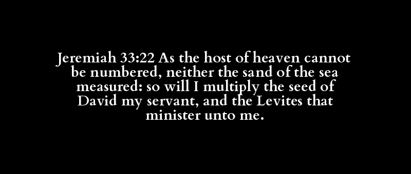 Jeremiah 33:22 As the host of heaven cannot be numbered, neither the sand of the sea measured: so will I multiply the seed of David my servant, and the Levites that minister unto me.