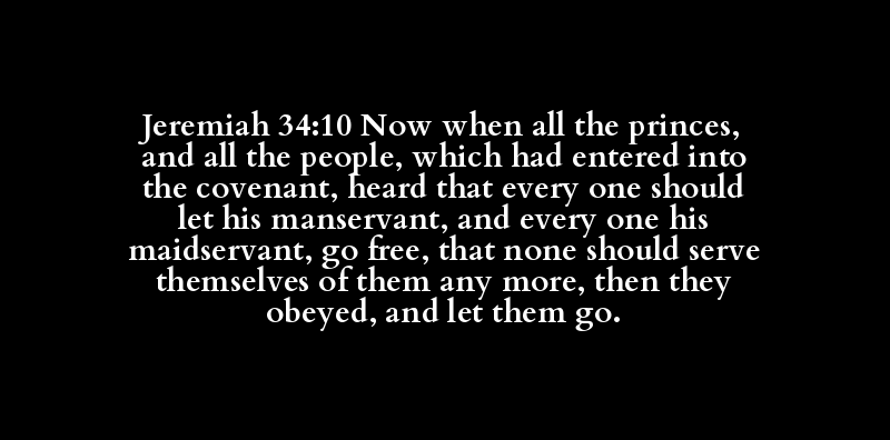 Jeremiah 34:10 Now when all the princes, and all the people, which had entered into the covenant, heard that every one should let his manservant, and every one his maidservant, go free, that none should serve themselves of them any more, then they obeyed, and let them go.