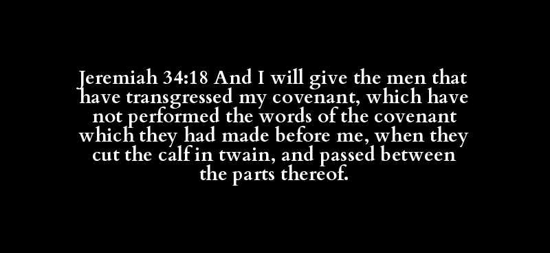 Jeremiah 34:18 And I will give the men that have transgressed my covenant, which have not performed the words of the covenant which they had made before me, when they cut the calf in twain, and passed between the parts thereof.