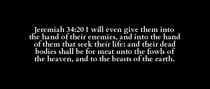 Jeremiah 34:20 I will even give them into the hand of their enemies, and into the hand of them that seek their life: and their dead bodies shall be for meat unto the fowls of the heaven, and to the beasts of the earth.