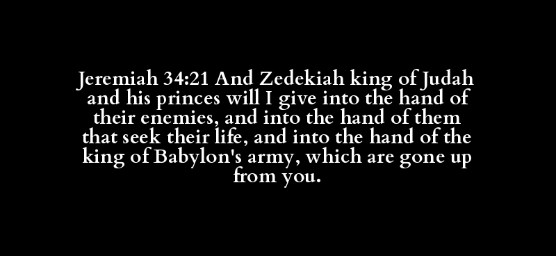 Jeremiah 34:21 And Zedekiah king of Judah and his princes will I give into the hand of their enemies, and into the hand of them that seek their life, and into the hand of the king of Babylon's army, which are gone up from you.