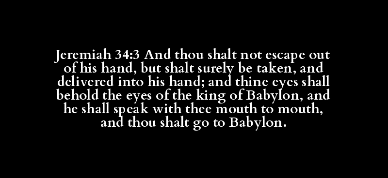 Jeremiah 34:3 And thou shalt not escape out of his hand, but shalt surely be taken, and delivered into his hand; and thine eyes shall behold the eyes of the king of Babylon, and he shall speak with thee mouth to mouth, and thou shalt go to Babylon.
