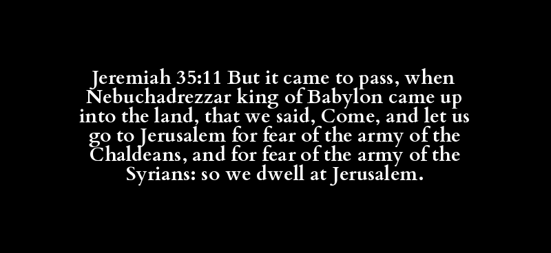 Jeremiah 35:11 But it came to pass, when Nebuchadrezzar king of Babylon came up into the land, that we said, Come, and let us go to Jerusalem for fear of the army of the Chaldeans, and for fear of the army of the Syrians: so we dwell at Jerusalem.