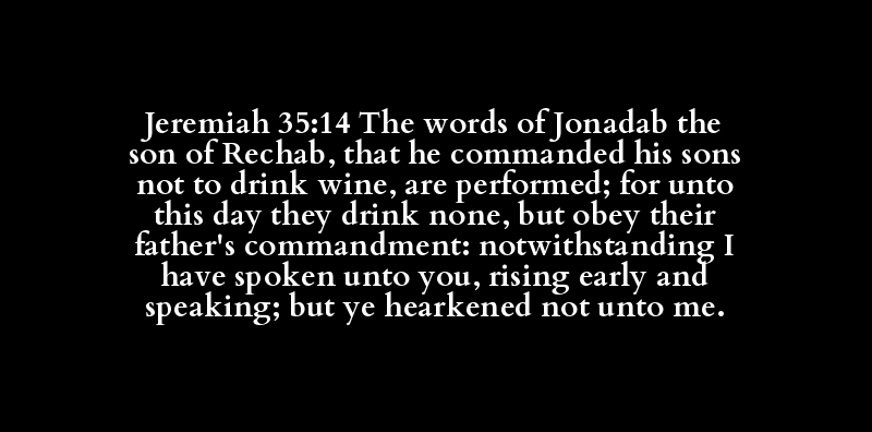 Jeremiah 35:14 The words of Jonadab the son of Rechab, that he commanded his sons not to drink wine, are performed; for unto this day they drink none, but obey their father's commandment: notwithstanding I have spoken unto you, rising early and speaking; but ye hearkened not unto me.