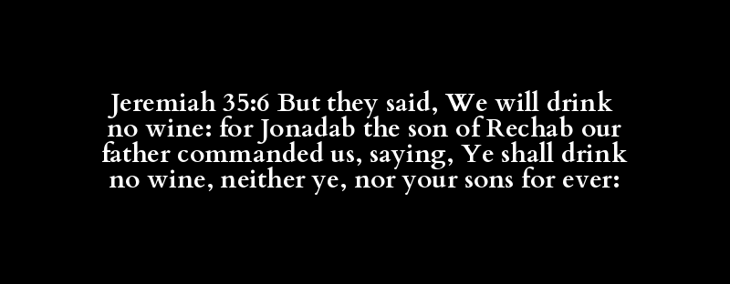 Jeremiah 35:6 But they said, We will drink no wine: for Jonadab the son of Rechab our father commanded us, saying, Ye shall drink no wine, neither ye, nor your sons for ever: