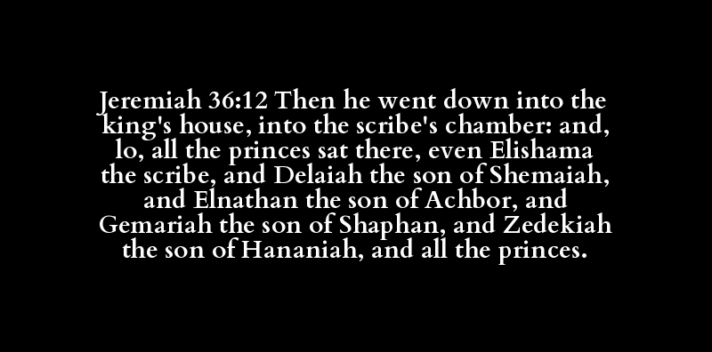 Jeremiah 36:12 Then he went down into the king's house, into the scribe's chamber: and, lo, all the princes sat there, even Elishama the scribe, and Delaiah the son of Shemaiah, and Elnathan the son of Achbor, and Gemariah the son of Shaphan, and Zedekiah the son of Hananiah, and all the princes.