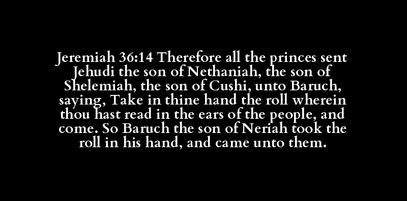 Jeremiah 36:14 Therefore all the princes sent Jehudi the son of Nethaniah, the son of Shelemiah, the son of Cushi, unto Baruch, saying, Take in thine hand the roll wherein thou hast read in the ears of the people, and come. So Baruch the son of Neriah took the roll in his hand, and came unto them.