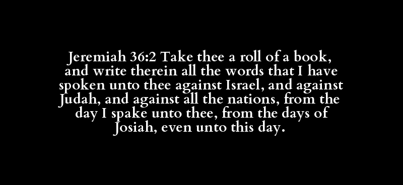 Jeremiah 36:2 Take thee a roll of a book, and write therein all the words that I have spoken unto thee against Israel, and against Judah, and against all the nations, from the day I spake unto thee, from the days of Josiah, even unto this day.