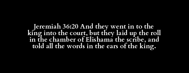 Jeremiah 36:20 And they went in to the king into the court, but they laid up the roll in the chamber of Elishama the scribe, and told all the words in the ears of the king.