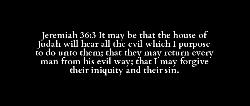 Jeremiah 36:3 It may be that the house of Judah will hear all the evil which I purpose to do unto them; that they may return every man from his evil way; that I may forgive their iniquity and their sin.