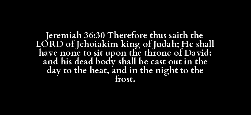 Jeremiah 36:30 Therefore thus saith the LORD of Jehoiakim king of Judah; He shall have none to sit upon the throne of David: and his dead body shall be cast out in the day to the heat, and in the night to the frost.