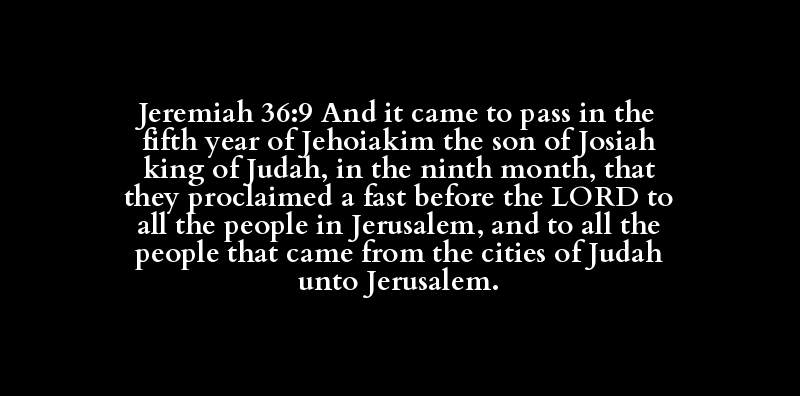 Jeremiah 36:9 And it came to pass in the fifth year of Jehoiakim the son of Josiah king of Judah, in the ninth month, that they proclaimed a fast before the LORD to all the people in Jerusalem, and to all the people that came from the cities of Judah unto Jerusalem.