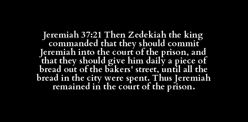 Jeremiah 37:21 Then Zedekiah the king commanded that they should commit Jeremiah into the court of the prison, and that they should give him daily a piece of bread out of the bakers' street, until all the bread in the city were spent. Thus Jeremiah remained in the court of the prison.