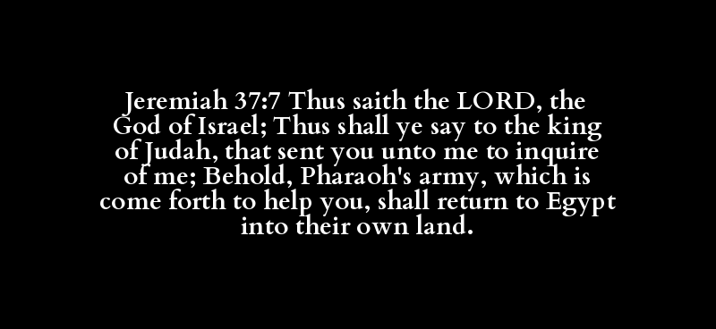 Jeremiah 37:7 Thus saith the LORD, the God of Israel; Thus shall ye say to the king of Judah, that sent you unto me to inquire of me; Behold, Pharaoh's army, which is come forth to help you, shall return to Egypt into their own land.