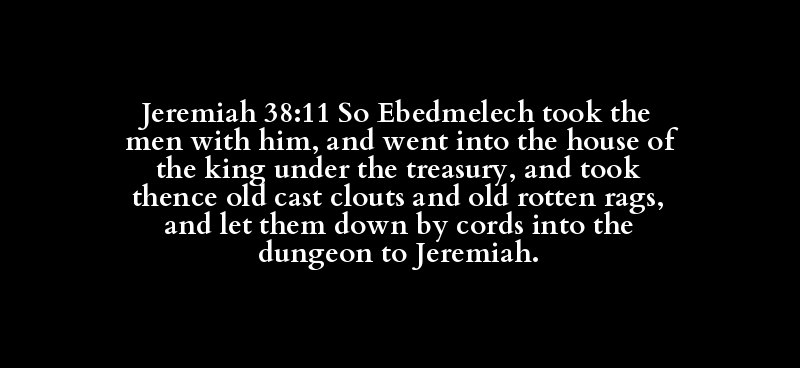 Jeremiah 38:11 So Ebedmelech took the men with him, and went into the house of the king under the treasury, and took thence old cast clouts and old rotten rags, and let them down by cords into the dungeon to Jeremiah.