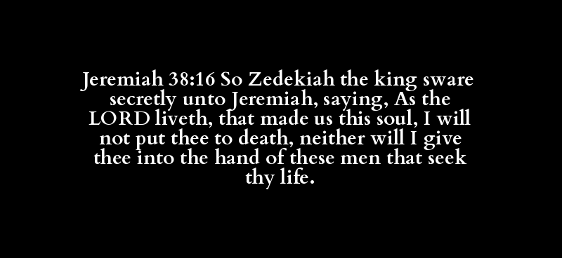 Jeremiah 38:16 So Zedekiah the king sware secretly unto Jeremiah, saying, As the LORD liveth, that made us this soul, I will not put thee to death, neither will I give thee into the hand of these men that seek thy life.