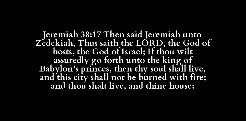 Jeremiah 38:17 Then said Jeremiah unto Zedekiah, Thus saith the LORD, the God of hosts, the God of Israel; If thou wilt assuredly go forth unto the king of Babylon's princes, then thy soul shall live, and this city shall not be burned with fire; and thou shalt live, and thine house: