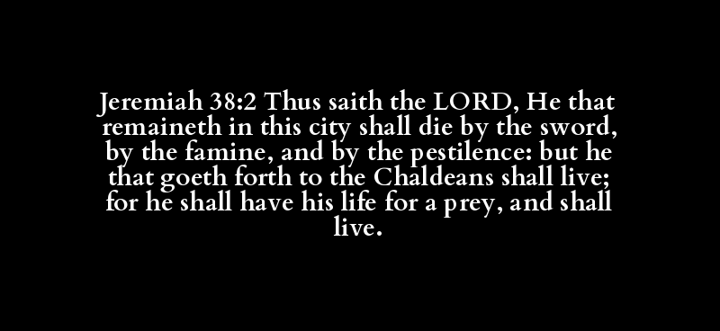 Jeremiah 38:2 Thus saith the LORD, He that remaineth in this city shall die by the sword, by the famine, and by the pestilence: but he that goeth forth to the Chaldeans shall live; for he shall have his life for a prey, and shall live.