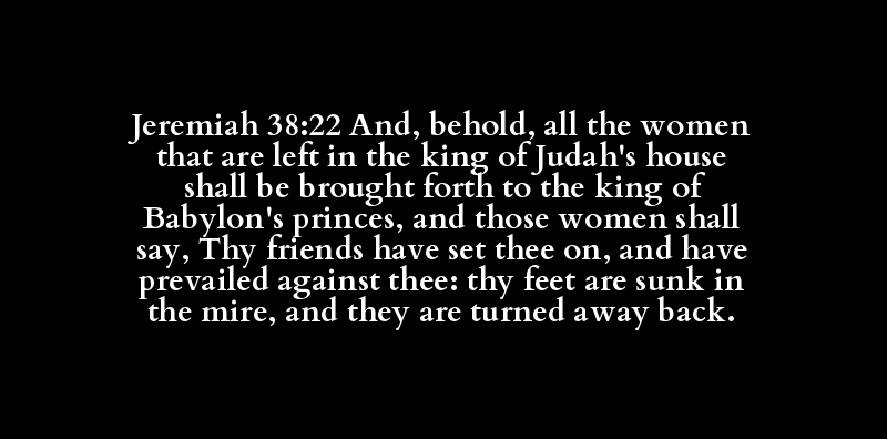 Jeremiah 38:22 And, behold, all the women that are left in the king of Judah's house shall be brought forth to the king of Babylon's princes, and those women shall say, Thy friends have set thee on, and have prevailed against thee: thy feet are sunk in the mire, and they are turned away back.