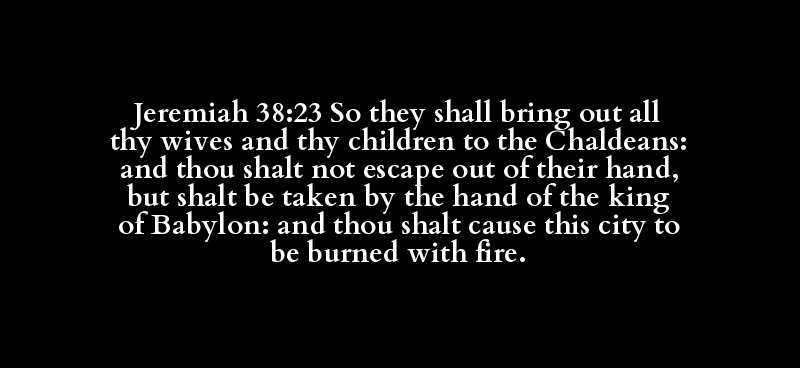 Jeremiah 38:23 So they shall bring out all thy wives and thy children to the Chaldeans: and thou shalt not escape out of their hand, but shalt be taken by the hand of the king of Babylon: and thou shalt cause this city to be burned with fire.