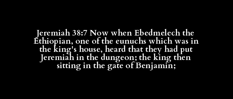 Jeremiah 38:7 Now when Ebedmelech the Ethiopian, one of the eunuchs which was in the king's house, heard that they had put Jeremiah in the dungeon; the king then sitting in the gate of Benjamin;