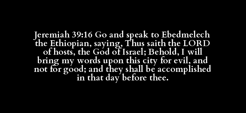 Jeremiah 39:16 Go and speak to Ebedmelech the Ethiopian, saying, Thus saith the LORD of hosts, the God of Israel; Behold, I will bring my words upon this city for evil, and not for good; and they shall be accomplished in that day before thee.
