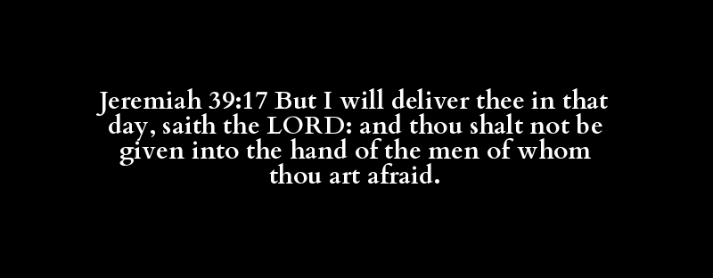 Jeremiah 39:17 But I will deliver thee in that day, saith the LORD: and thou shalt not be given into the hand of the men of whom thou art afraid.