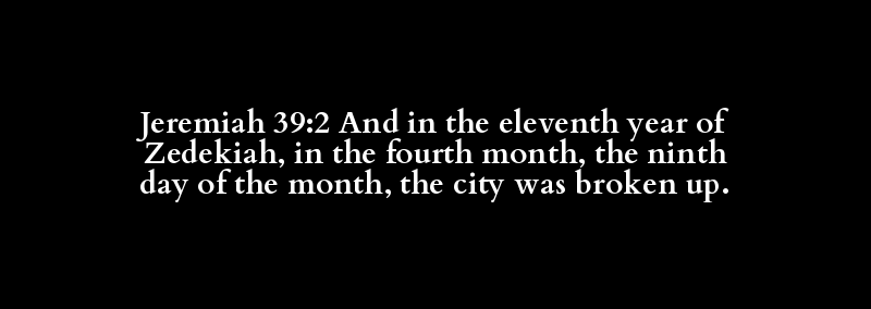 Jeremiah 39:2 And in the eleventh year of Zedekiah, in the fourth month, the ninth day of the month, the city was broken up.